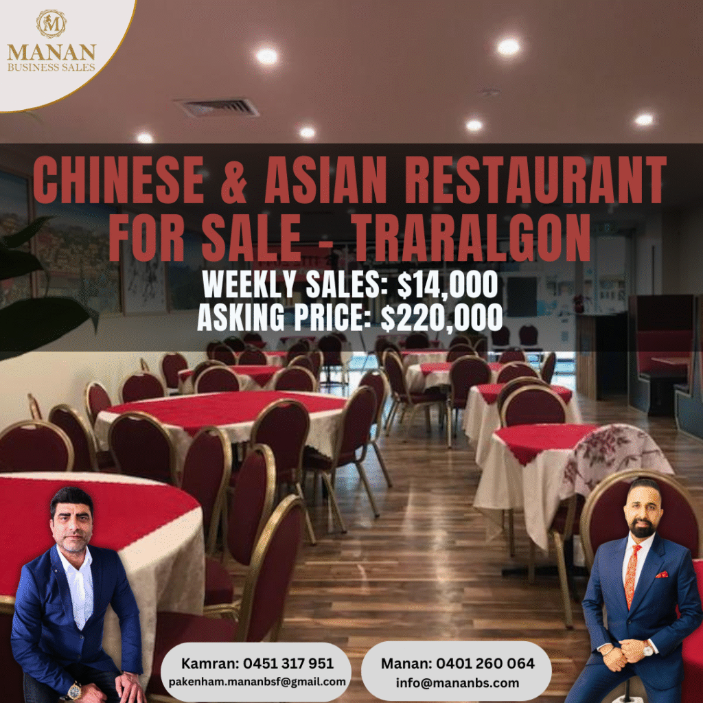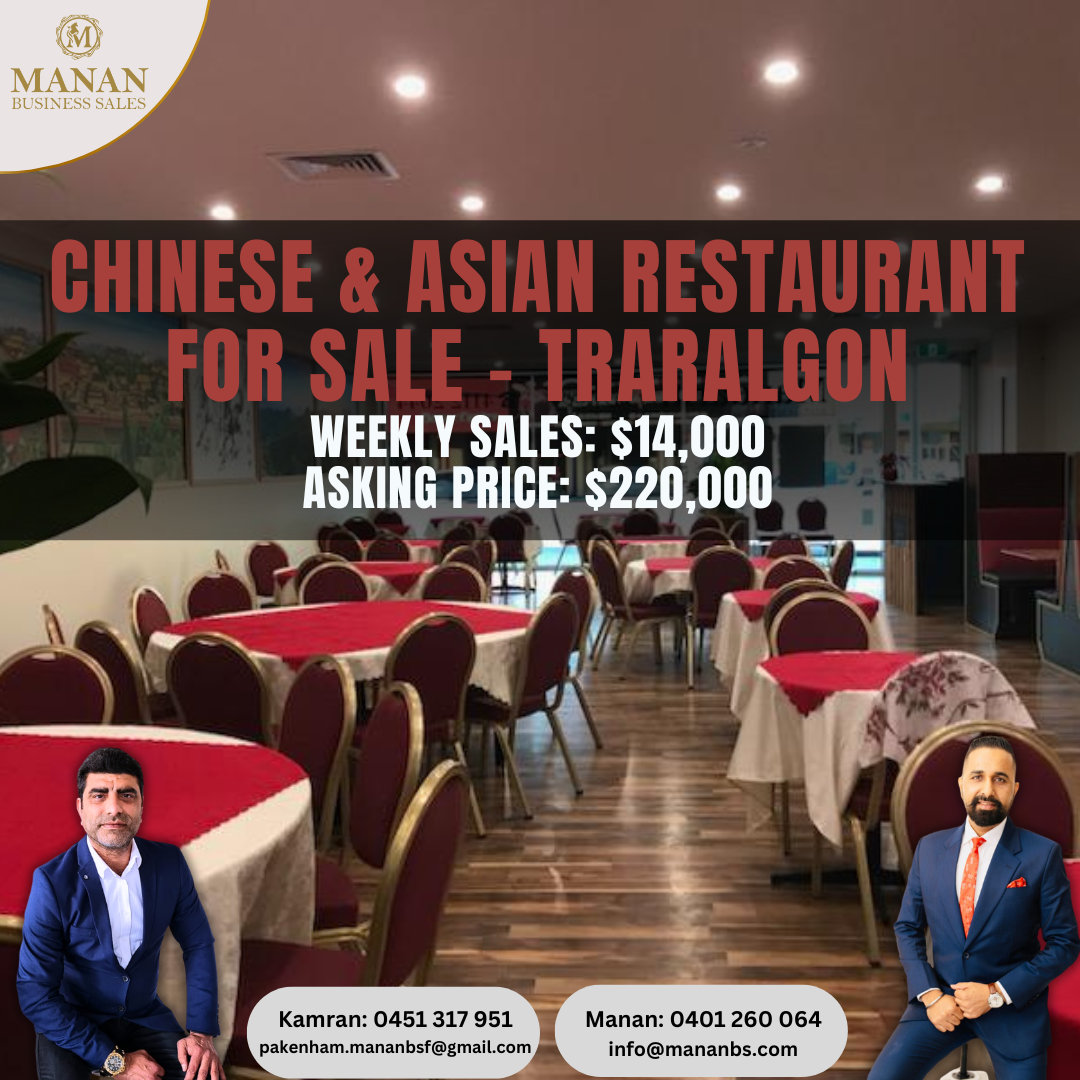 Manan Business Sales proudly presents a rare opportunity to acquire a well-established Chinese and Asian restaurant in the thriving regional hub of Traralgon, Victoria. This fully operational and turnkey business is renowned for offering authentic Chinese, Malaysian, and Thai cuisine, and enjoys an exceptional reputation among locals and visitors alike. With a strong community presence, professional fit-out, and multiple revenue streams, this business is perfectly positioned for a new owner to walk in and continue operations seamlessly.