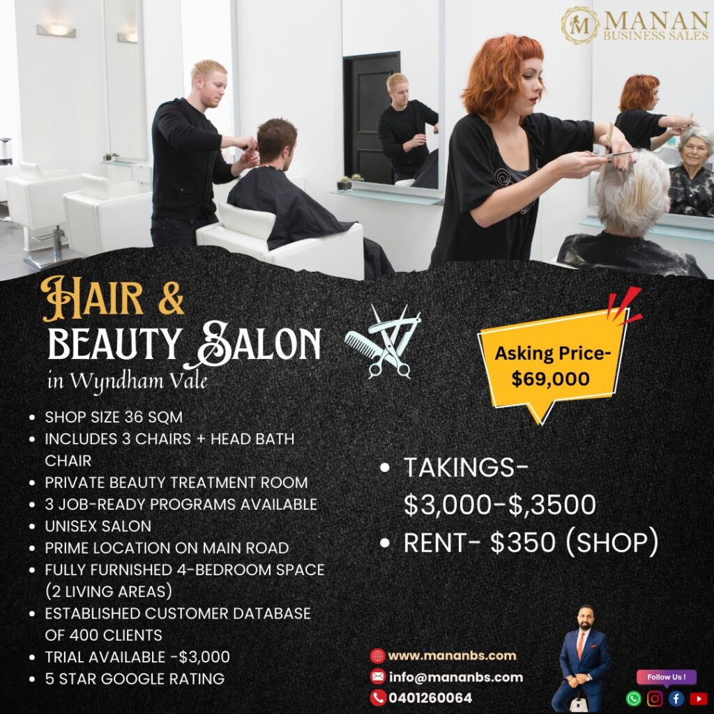 Whether you’re an entrepreneur or an investor, this hair and beauty salon offers immense growth potential. Contact Manan Business Sales today to learn more or to schedule a viewing. Don’t miss out on this fantastic business opportunity!