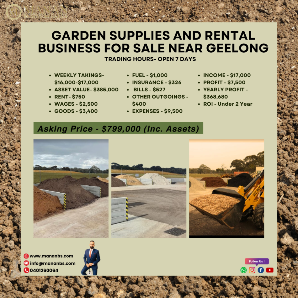 Thriving Garden Supplies & Rental Business for Sale near Geelong This owner-operated business offers premium sand, soil, and equipment rentals with a 20-year lease in a high-demand area. Listed by Manan Business Sales, it presents a fantastic opportunity for growth in a stable market.