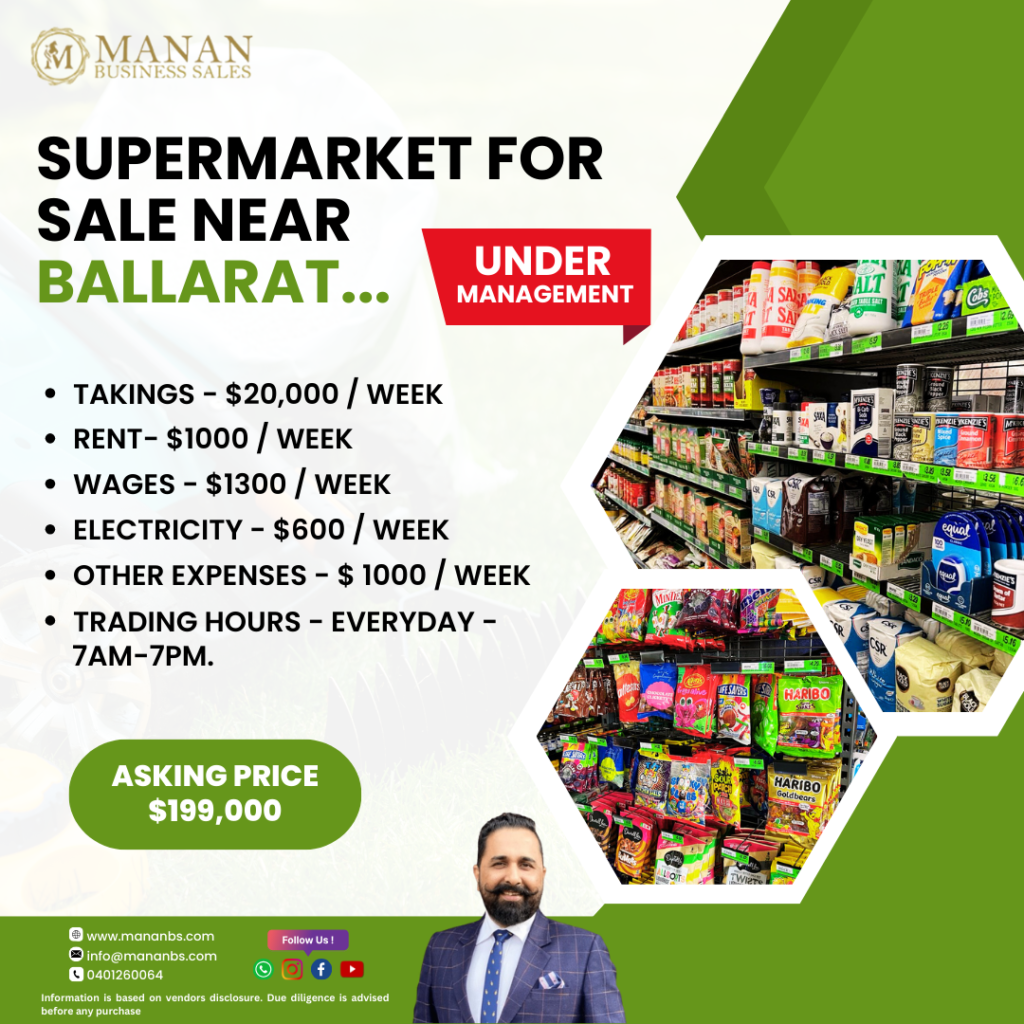 Unlock the potential of a profitable business with this thriving supermarket for sale near Ballarat, offered through Manan Business Sales. This well-established supermarket, currently under management, is an excellent investment opportunity for entrepreneurs looking to step into a successful venture with solid profit margins.